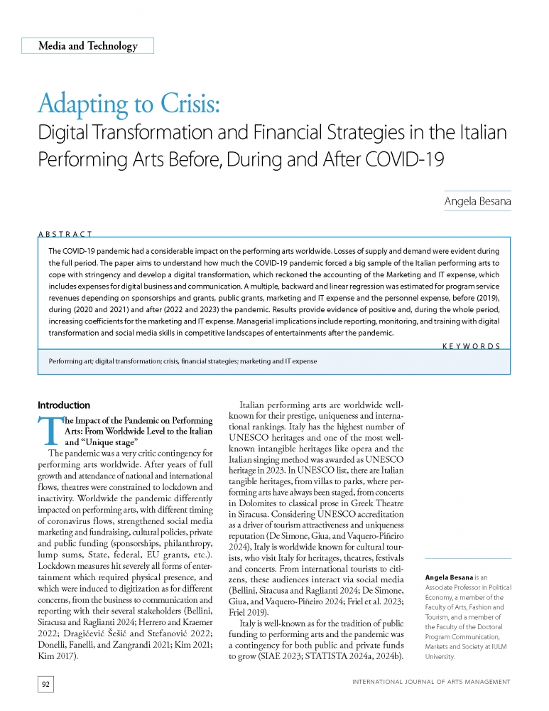 Performing art; digital transformation; crisis, financial strategies; marketing and IT expense
