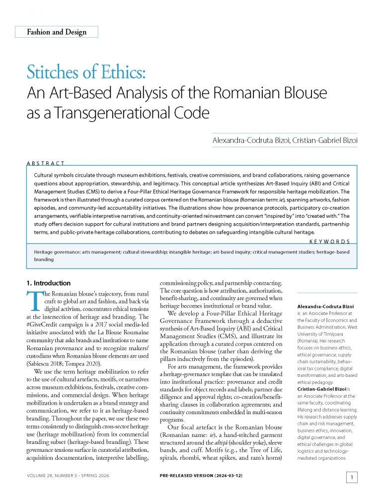 Cultural symbols circulate through museum exhibitions, festivals, creative commissions, and brand collaborations, raising governance questions about appropriation, stewardship, and legitimacy. This conceptual article synthesizes Art-Based Inquiry (ABI) and Critical Management Studies (CMS) to derive a Four-Pillar Ethical Heritage Governance Framework for responsible heritage mobilization. The framework is then illustrated through a curated corpus centered on the Romanian blouse (Romanian term: ie), spanning artworks, fashion episodes, and community-led accountability initiatives. The illustrations show how provenance protocols, participatory co-creation arrangements, verifiable interpretive narratives, and continuity-oriented reinvestment can convert “inspired by” into “created with.” The study offers decision support for cultural institutions and brand partners designing acquisition/interpretation standards, partnership terms, and public-private heritage collaborations, contributing to debates on safeguarding intangible cultural heritage.