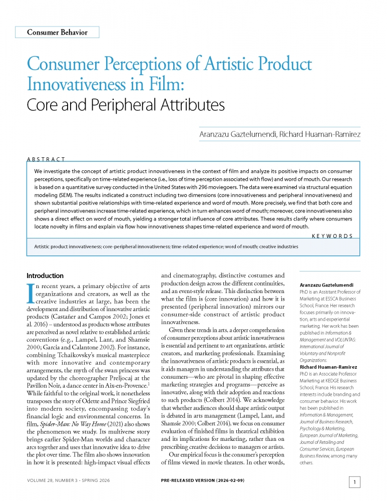 We investigate the concept of artistic product innovativeness in the context of film and analyze its positive impacts on consumer perceptions, specifically on time-related experience (i.e., loss of time perception associated with flow) and word of mouth. Our research is based on a quantitative survey conducted in the United States with 296 moviegoers. The data were examined via structural equation modeling (SEM). The results indicated a construct including two dimensions (core innovativeness and peripheral innovativeness) and shown substantial positive relationships with time-related experience and word of mouth. More precisely, we find that both core and peripheral innovativeness increase time-related experience, which in turn enhances word of mouth; moreover, core innovativeness also shows a direct effect on word of mouth, yielding a stronger total influence of core attributes. These results clarify where consumers locate novelty in films and explain via flow how innovativeness shapes time-related experience and word of mouth.