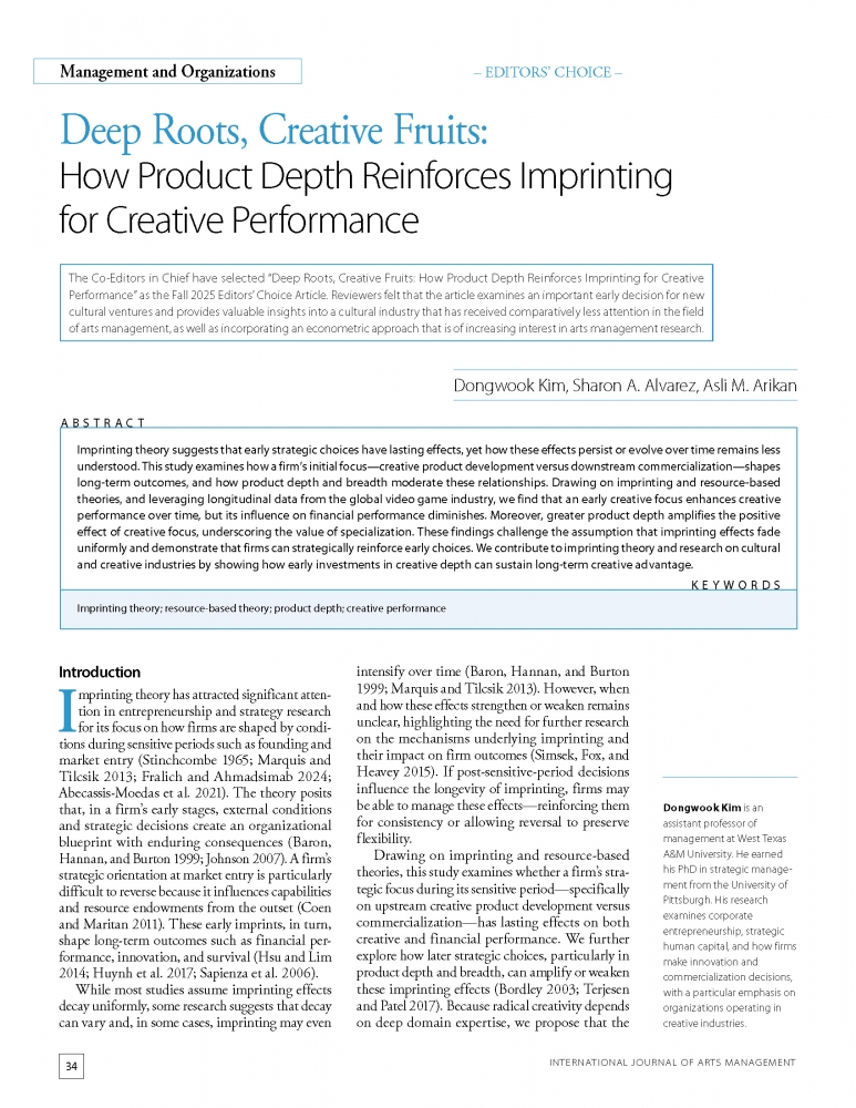 Imprinting theory suggests that early strategic choices have lasting effects, yet how these effects persist or evolve over time remains less understood. This study examines how a firm’s initial focus—creative product development versus downstream commercialization—shapes long-term outcomes, and how product depth and breadth moderate these relationships. Drawing on imprinting and resource-based theories, and leveraging longitudinal data from the global video game industry, we find that an early creative focus enhances creative performance over time, but its influence on financial performance diminishes. Moreover, greater product depth amplifies the positive effect of creative focus, underscoring the value of specialization. These findings challenge the assumption that imprinting effects fade uniformly and demonstrate that firms can strategically reinforce early choices. We contribute to imprinting theory and research on cultural and creative industries by showing how early investments in creative depth can sustain long-term creative advantage.