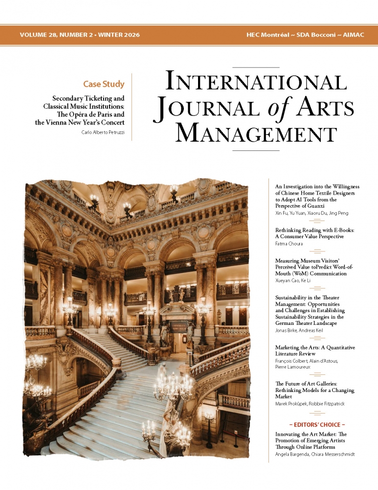Digital technology underlies two additional Academic Research articles in this issue, with Xin Fu, Yu Yuan, Xiaoru Du, and Jing Peng examining how the Chinese social mechanism of Guanxi affects textile designers’ likelihood to adopt artificial intelligence tools in their work, and Fatma Choura exploring the consumption values derived from digital or e-reading. In the remaining Academic Research articles, Jonas Burke and Andreas Keil analyze the role of the equally current issue of sustainability in the German theater industry, while Xueyan Cao and Ke Li give us a new validated measure of museum visitors’ perceived value and François Colbert, Alain d’Astous, and Pierre Lamoureux provide a historical view of the literature on marketing the arts.