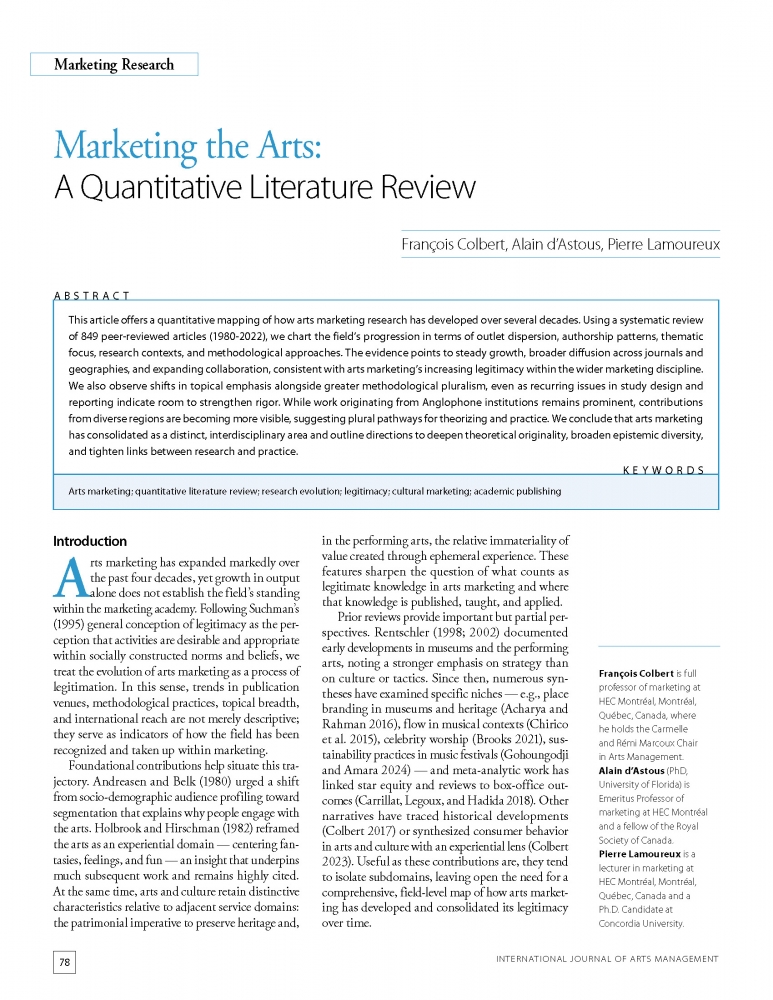 Arts marketing; quantitative literature review; research evolution; legitimacy; cultural marketing; academic publishing